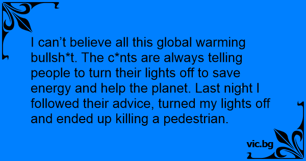 I can’t believe all this global warming bullsh*t. The c*nts are always telling people to turn their lights off to save energy and help the planet. Last night I followed their advice, turned my lights off and ended up killing a pedestrian.