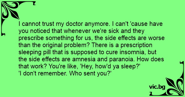 I cannot trust my doctor anymore. I can't 'cause have you noticed that whenever we're sick and they prescribe something for us, the side effects are worse than the original problem? There is a prescription sleeping pill that is supposed to cure insomnia, but the side effects are amnesia and paranoia. How does that work? You're like, 'Hey, how'd ya sleep?'