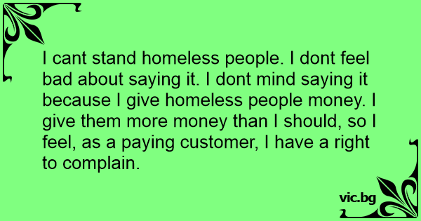 I cant stand homeless people. I dont feel bad about saying it. I dont mind saying it because I give homeless people money. I give them more money than I should, so I feel, as a paying customer, I have a right to complain.