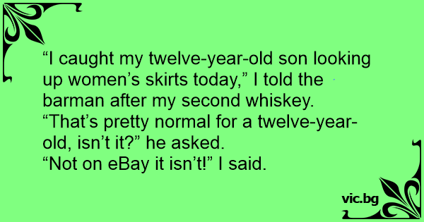 “I caught my twelve-year-old son looking up women’s skirts today,” I told the barman after my second whiskey.