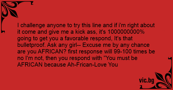 I challenge anyone to try this line and if i'm right about it come and give me a kick аss, it's 1000000000% going to get you a favorable respond, It's that bulletproof. Ask any girl-- Excuse me by any chance are you AFRICAN? first response will 99-100 times be no I'm not, then you respond with "You must be AFRICAN because Ah-Frican-Love You