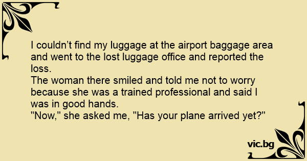 I couldn’t find my luggage at the airport baggage area and went to the lost luggage office and reported the loss. The woman there smiled and told me not to worry because she was a trained professional and said I was in good hands. "Now," she asked me, "Has your plane arrived yet?"