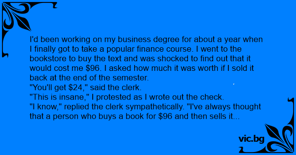 "I know," replied the clerk sympathetically. "I've always thought that a person who buys a book for $96 and then sells it back for $24 should fail the course."