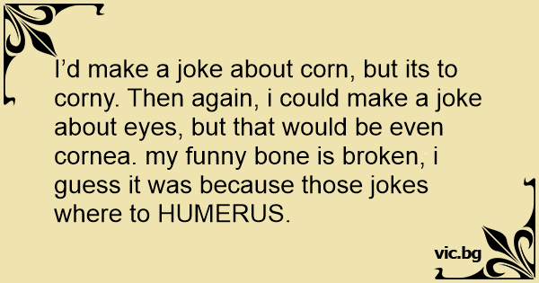 I’d make a joke about corn, but its to corny. Then again, i could make a joke about eyes, but that would be even cornea. my funny воnе is broken, i guess it was because those jokes where to HUMERUS.