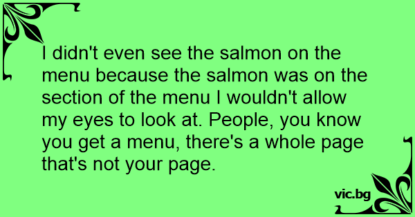 I didn't even see the salmon on the menu because the salmon was on the section of the menu I wouldn't allow my eyes to look at. People, you know you get a menu, there's a whole page that's not your page.