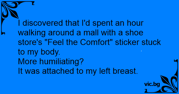 I discovered that I'd spent an hour walking around a mall with a shoe store's "Feel the Comfort" sticker stuck to my body.