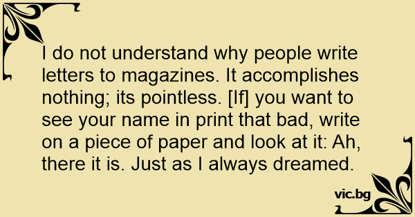 I do not understand why people write letters to magazines. It accomplishes nothing; its pointless. [If] you want to see your name in print that bad, write on a piece of paper and look at it: Ah, there it is. Just as I always dreamed.