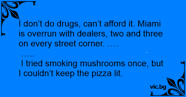 I don’t do drugs, can’t afford it. Miami is overrun with dealers, two and three on every street corner. ….