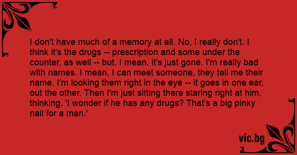 I don't have much of a memory at all. No, I really don't. I think it's the drugs -- prescription and some under the counter, as well -- but, I mean, it's just gone. I'm really bad with names. I mean, I can meet someone, they tell me their name, I'm looking them right in the eye -- it goes in one ear, out the other. Then I'm just sitting there staring right at him, thinking, 'I wonder if he has any drugs? That's a big pinky nail for a man.'