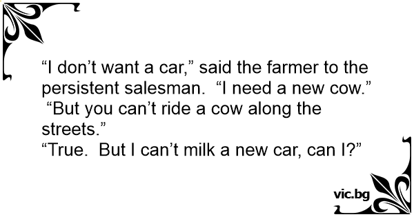 “I don’t want a car,” said the farmer to the persistent salesman. “I need a new соw.”