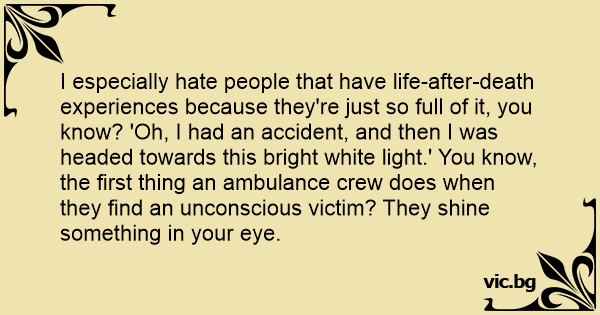 I especially hate people that have life-after-death experiences because they're just so full of it, you know? 'Oh, I had an accident, and then I was headed towards this bright white light.' You know, the first thing an ambulance crew does when they find an unconscious victim? They shine something in your eye.