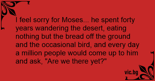 I feel sorry for Моsеs... he spent forty years wandering the desert, eating nothing but the bread off the ground and the occasional bird, and every day a million people would come up to him and ask, "Are we there yet?"