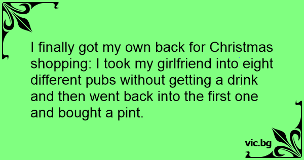 I finally got my own back for Christmas shopping: I took my girlfriend into eight different pubs without getting a drink and then went back into the first one and bought a pint.