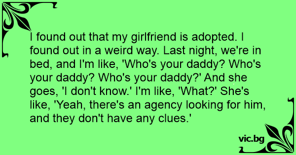 I found out that my girlfriend is adopted. I found out in a weird way. Last night, we're in bed, and I'm like, 'Who's your daddy? Who's your daddy? Who's your daddy?' And she goes, 'I don't know.' I'm like, 'What?' She's like, 'Yeah, there's an agency looking for him, and they don't have any clues.'