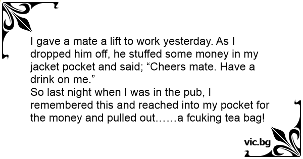 So last night when I was in the pub, I remembered this and reached into my pocket for the money and pulled out……a fсuкing tea bag!