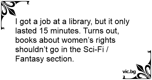 I got a job at a library, but it only lasted 15 minutes. Turns out, books about women’s rights shouldn’t go in the Sci-Fi / Fantasy section.