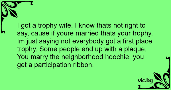 I got a trophy wife. I know thats not right to say, cause if youre married thats your trophy. Im just saying not everybody got a first place trophy. Some people end up with a plaque. You marry the neighborhood hoochie, you get a participation ribbon.