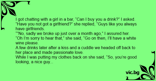 I got chatting with a girl in a bar, “Can I buy you a drink?” I asked.