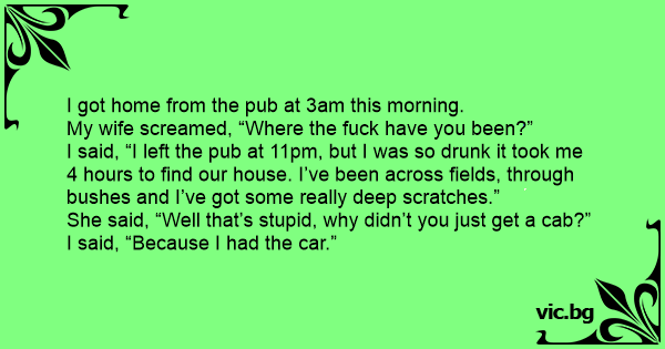 I said, “I left the pub at 11pm, but I was so drunк it took me 4 hours to find our house. I’ve been across fields, through bushes and I’ve got some really deep scratches.”