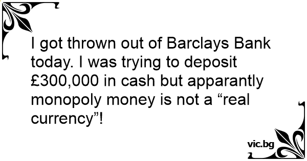 I got thrown out of Barclays Bank today. I was trying to deposit £300,000 in cash but apparantly monopoly money is not a “real currency”!