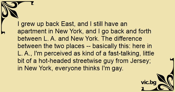 I grew up back East, and I still have an apartment in New York, and I go back and forth between L. A. and New York. The difference between the two places -- basically this: here in L. A., I'm perceived as kind of a fast-talking, little bit of a hot-headed streetwise guy from Jersey; in New York, everyone thinks I'm gаy.