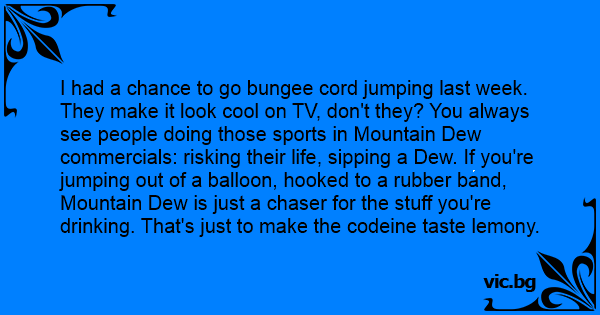 I had a chance to go bungee cord jumping last week. They make it look cool on TV, don't they? You always see people doing those sports in Mountain Dew commercials: risking their life, sipping a Dew. If you're jumping out of a balloon, hooked to a rubber band, Mountain Dew is just a chaser for the stuff you're drinking. That's just to make the codeine taste lemony.