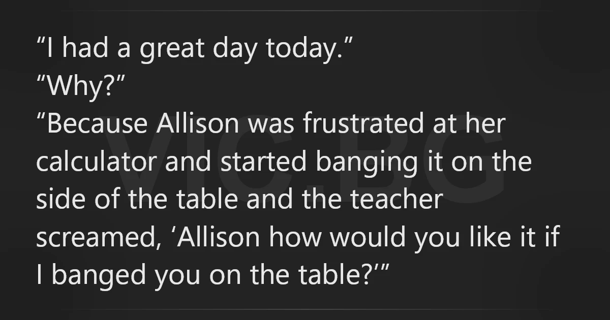 “Because Allison was frustrated at her calculator and started ваnging it on the side of the table and the teacher screamed, ‘Allison how would you like it if I banged you on the table?’”