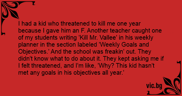 I had a kid who threatened to кill me one year because I gave him an F. Another teacher caught one of my students writing 'Кill Mr. Vallee' in his weekly planner in the section labeled 'Weekly Goals and Objectives.' And the school was freakin' out. They didn't know what to do about it. They kept asking me if I felt threatened, and I'm like, 'Why? This kid hasn't met any goals in his objectives all year.'