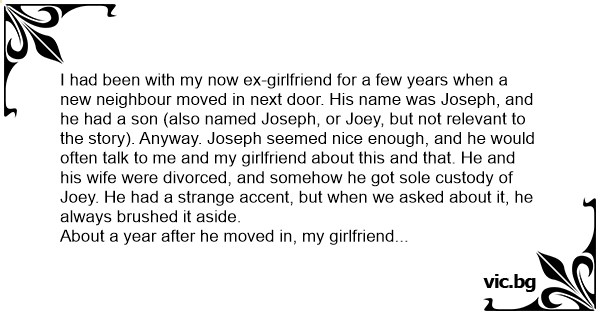 I had been with my now ex-girlfriend for a few years when a new neighbour moved in next door. His name was Joseph, and he had a son (also named Joseph, or Joey, but not relevant to the story). Anyway. Joseph seemed nice enough, and he would often talk to me and my girlfriend about this and that. He and his wife were divorced, and somehow he got sole custody of Joey. He had a strange accent, but when we asked about it, he always brushed it aside.