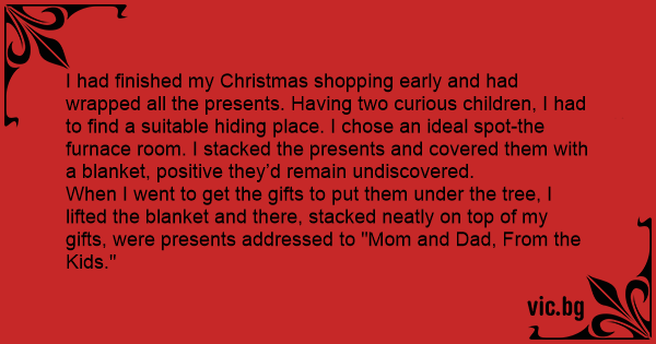 When I went to get the gifts to put them under the tree, I lifted the blanket and there, stacked neatly on top of my gifts, were presents addressed to "Mom and Dad, From the Kids."