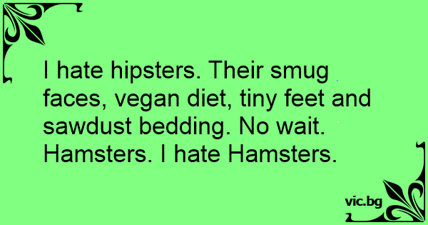I hate hipsters. Their smug faces, vegan diet, tiny feet and sawdust bedding. No wait. Hamsters. I hate Hamsters.