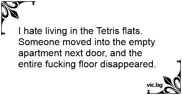 I hate living in the Tetris flats. Someone moved into the empty apartment next door, and the entire fuскing floor disappeared.