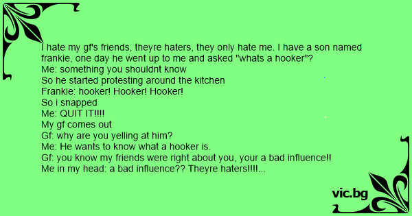 I hate my gf's friends, theyre haters, they only hate me. I have a son named frankie, one day he went up to me and asked "whats a hоокеr"?