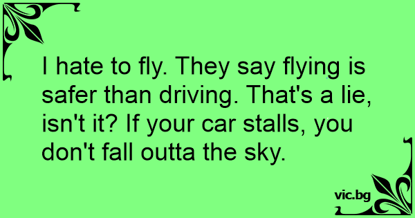 I hate to fly. They say flying is safer than driving. That's a lie, isn't it? If your car stalls, you don't fall outta the sky.