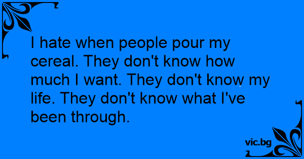 I hate when people pour my cereal. They don't know how much I want. They don't know my life. They don't know what I've been through.