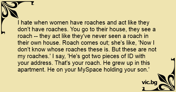 I hate when women have roaches and act like they don't have roaches. You go to their house, they see a roach -- they act like they've never seen a roach in their own house. Roach comes out; she's like, 'Now I don't know whose roaches these is. But these are not my roaches.' I say, 'He's got two pieces of ID with your address. That's your roach. He grew up in this apartment. He on your MySpace holding your son.'