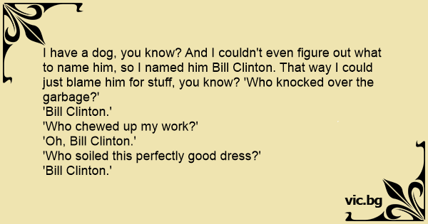 I have a dog, you know? And I couldn't even figure out what to name him, so I named him Bill Clinton. That way I could just blame him for stuff, you know? 'Who knocked over the garbage?'
