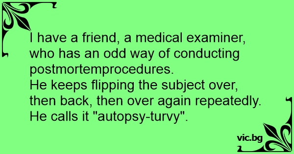 I have a friend, a medical examiner, who has an odd way of conducting postmortemprocedures.