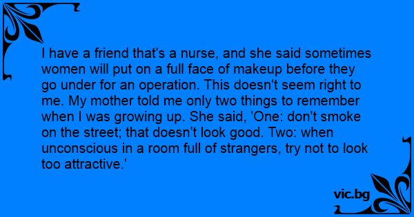 I have a friend that's a nurse, and she said sometimes women will put on a full face of makeup before they go under for an operation. This doesn't seem right to me. My mother told me only two things to remember when I was growing up. She said, 'One: don't smoke on the street; that doesn't look good. Two: when unconscious in a room full of strangers, try not to look too attractive.'
