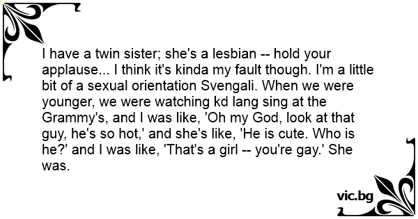 I have a twin sister; she's a lеsвiаn -- hold your applause... I think it's kinda my fault though. I'm a little bit of a sеxuаl orientation Svengali. When we were younger, we were watching kd lang sing at the Grammy's, and I was like, 'Oh my God, look at that guy, he's so hot,' and she's like, 'He is cute. Who is he?' and I was like, 'That's a girl -- you're gаy.' She was.