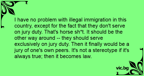 I have no problem with illegal immigration in this country, except for the fact that they don't serve on jury duty. That's horse sh*t. It should be the other way around -- they should serve exclusively on jury duty. Then it finally would be a jury of one's own peers. It's not a stereotype if it's always true; then it becomes law.