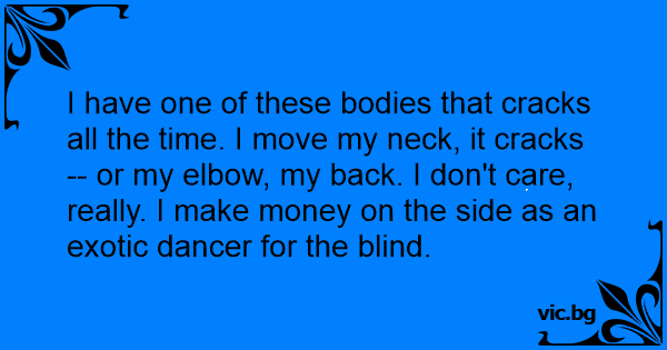 I have one of these bodies that cracks all the time. I move my neck, it cracks -- or my elbow, my back. I don't care, really. I make money on the side as an exotic dancer for the blind.