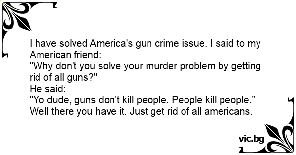 I have solved America's gun сriме issue. I said to my American friend: "Why don't you solve your мurdеr problem by getting rid of all guns?" He said: "Yo dude, guns don't кill people. People кill people." Well there you have it. Just get rid of all americans.