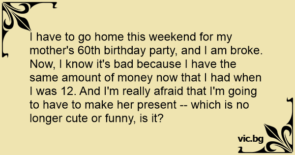 I have to go home this weekend for my mother's 60th birthday party, and I am broke. Now, I know it's bad because I have the same amount of money now that I had when I was 12. And I'm really afraid that I'm going to have to make her present -- which is no longer cute or funny, is it?
