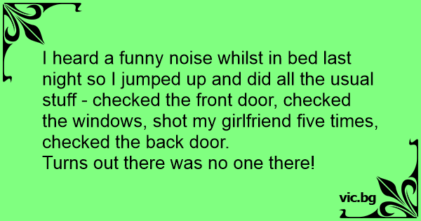 I heard a funny noise whilst in bed last night so I jumped up and did all the usual stuff - checked the front door, checked the windows, shot my girlfriend five times, checked the back door.