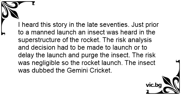 I heard this story in the late seventies. Just prior to a manned launch an insect was heard in the superstructure of the rocket. The risk analysis and decision had to be made to launch or to delay the launch and purge the insect. The risk was negligible so the rocket launch. The insect was dubbed the Gemini Cricket.