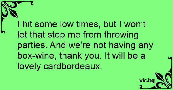 I hit some low times, but I won’t let that stop me from throwing parties. And we’re not having any box-wine, thank you. It will be a lovely cardbordeaux.