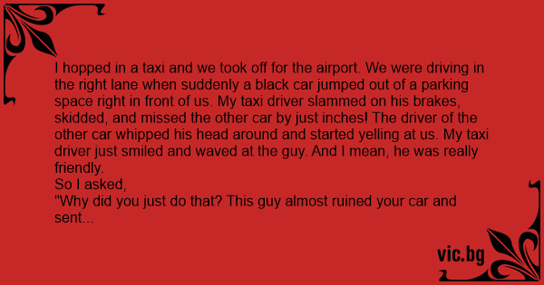 I hopped in a taxi and we took off for the airport. We were driving in the right lane when suddenly a black car jumped out of a parking space right in front of us. My taxi driver slammed on his brakes, skidded, and missed the other car by just inches! The driver of the other car whipped his head around and started yelling at us. My taxi driver just smiled and waved at the guy. And I mean, he was really friendly.
