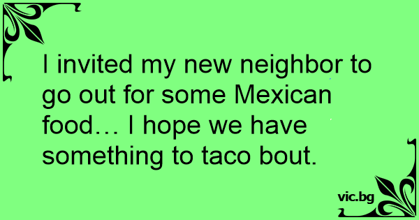 I invited my new neighbor to go out for some Mexican food… I hope we have something to taco bout.