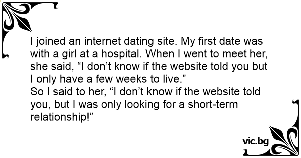 I joined an internet dating site. My first date was with a girl at a hospital. When I went to meet her, she said, “I don’t know if the website told you but I only have a few weeks to live.”